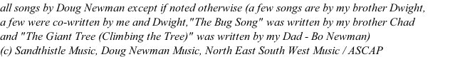 Cascade Creek by Doug and Dwight Newman My Dog Has Fleas - Doug Newman a little tune (a silly little tune) - Doug Newman I Love the Rain - Doug Newman Goin' to Winfield (Winfield Rag) Send Her Back to Me - Doug Newman Fishing with Grandpa a silent rain - Doug Newman Kittens for Free - Doug Newman Whistle Tune - Doug Newman The Sandhill Waltz The Coming of the Rain - Doug Newman Good Morning  - Doug Newman Ba Ba Ba - Doug Newman Turning Orange - Doug Newman Guitar Happy Time - Doug Newman the bug song - Doug Newman Mr. Spider - Doug Newman Indian Summer's Raga Lullaby - Doug Newman Old MacDonald's Farm Living in His Shoe - Doug Newman Happy Happy Birthday - Doug Newman I Loved Ginger - Doug Newman Gibson lg3 guitar - Doug Newman A Cowboy's Lament - Doug Newman (c) Sandthisltle Music / ASCAP   Indian Summer's Lullaby - Doug Newman bio - Doug Newman Song Lyrics: Doug Newman Contact: Doug Newman page two : Doug Newman Music Sea Anemones - Doug Newman page three : Doug Newman Music Guitar and Mandolin Serenade Doug Newman albums- Doug Newman Say That I Love You - Doug Newman A Country Boy and Girl - Doug Newman Ever the Rain          (with Mandolin) Bubbles in the Sea Doug Newman Music.com Cascade Creek              (banjo instrumental) Don’t Cry Bears              (with Mandolin) Buddy the Doggone Cricket Doug Newman music page five Bubbles in the Sea Six String Rag                      (mandolin instrumental) 14 Six String Rag - Doug Newman clip.mp3 Skating by Moonlight         (mandolin instrumental) The Archipelago (guitar instrumental) Doug Newman - The Archipelago Skating by Moonlight by Doug Newman Bye Bye Love             (banjo instrumental) youtube catalbum.com music: page one Parfinagled Spring Pudding - Doug Newman I Hear the Wind - Doug Newman Aint Comin' Back - Doug Newman Wish You Knew - Doug Newman Go Away from My Window - Doug Newman page one b doug newman page one handwritten © Doug Newman Scottish Mandolin As Long As I’ve Got You The Happy Ants  from “The Sandhill Waltz” from “The Sandhill Waltz” from “The Sandhill Waltz” from “The Sandhill Waltz” from “The Sandhill Waltz” from “Ba Ba Ba” from “Ba Ba Ba” from “Ba Ba Ba” from “Ba Ba Ba” from “Bugs and Critters” from “Bugs and Critters” from “Bugs and Critters” from “Bugs and Critters” from “Bugs and Critters” from “Bugs and Critters” from “Ba Ba Ba” from “Ba Ba Ba” from “Ba Ba Ba” from “The Cat Album” from “The Sandhill Waltz” from “Rain Songs (Songs for a Rainy Day” from “Rain Songs (Songs for a Rainy Day” from “Rain Songs (Songs for a Rainy Day” from “Songs I’m Singing Right Now” from “Guitar Tunes” from “Guitar Tunes” from “Guitar Tunes” from “Guitar Tunes” from “Ba Ba Ba” from “Mandolin Tunes” from “Mandolin Tunes” from “Tin Can Avenue” from “Mandolin Tunes” from “Guitar Tunes” from “Guitar Tunes” from “Red Beans and Rice and Other Songs of the Dusty Trail” from “Red Beans and Rice and Other Songs of the Dusty Trail” from “Red Beans and Rice and Other Songs of the Dusty Trail” from “Red Beans and Rice and Other Songs of the Dusty Trail” The Giant Tree (Climbing the Tree) by Bo Newman available at iTunes ,Google Play The Giant Tree by Bo Newman - Doug Newman from “The Sandhill Waltz” from “Sierra Skies” from “Tin Can Avenue” from “Mandolin Tunes” from “Critters and Bugs” (with Mandolin) Google Play iTunes amazon (mostly song clips - with verse and chorus) (click on the titles to play) 03 good morning by doug newman clip.mp3 11 the coming of the rain - doug newman clip.mp3 15 - I love the rain by doug newman clip.mp3 10 Ain't Comin' Back - Doug Newman clip.mp3 01 A Silent Rain by Doug Newman clip.mp3 from “Bugs and Critters”